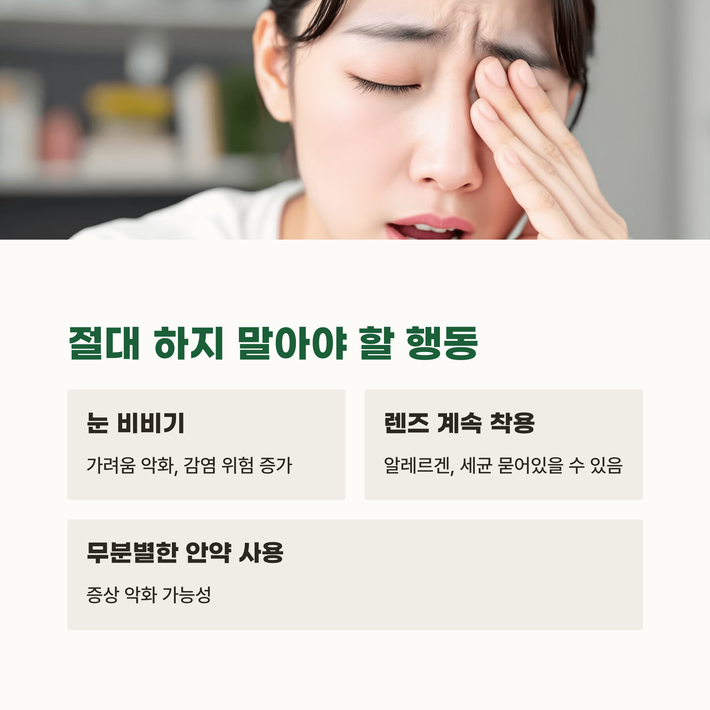 가장 흔한 실수는 눈을 손으로 비비는 거예요. 가려움이 더 심해지고 감염의 위험까지 생기니까 무조건 피하셔야 해요! 저도 무심코 손으로 문질렀다가 다음 날 눈이 퉁퉁 부은 적 있었어요. 렌즈 착용 중이라면 바로 빼는 게 좋아요. 렌즈 표면에 알레르겐이나 세균이 붙어 있을 수 있거든요. 또한 약국에서 성인용 안약을 그냥 사서 쓰는 것도 절대 금지입니다. 정확한 원인 파악 없이 함부로 약 쓰면 증상이 더 심해질 수 있어요. 응급처치 후에도 가려움이 계속된다면 전문가의 진료를 빠르게 받아보셔야 해요.