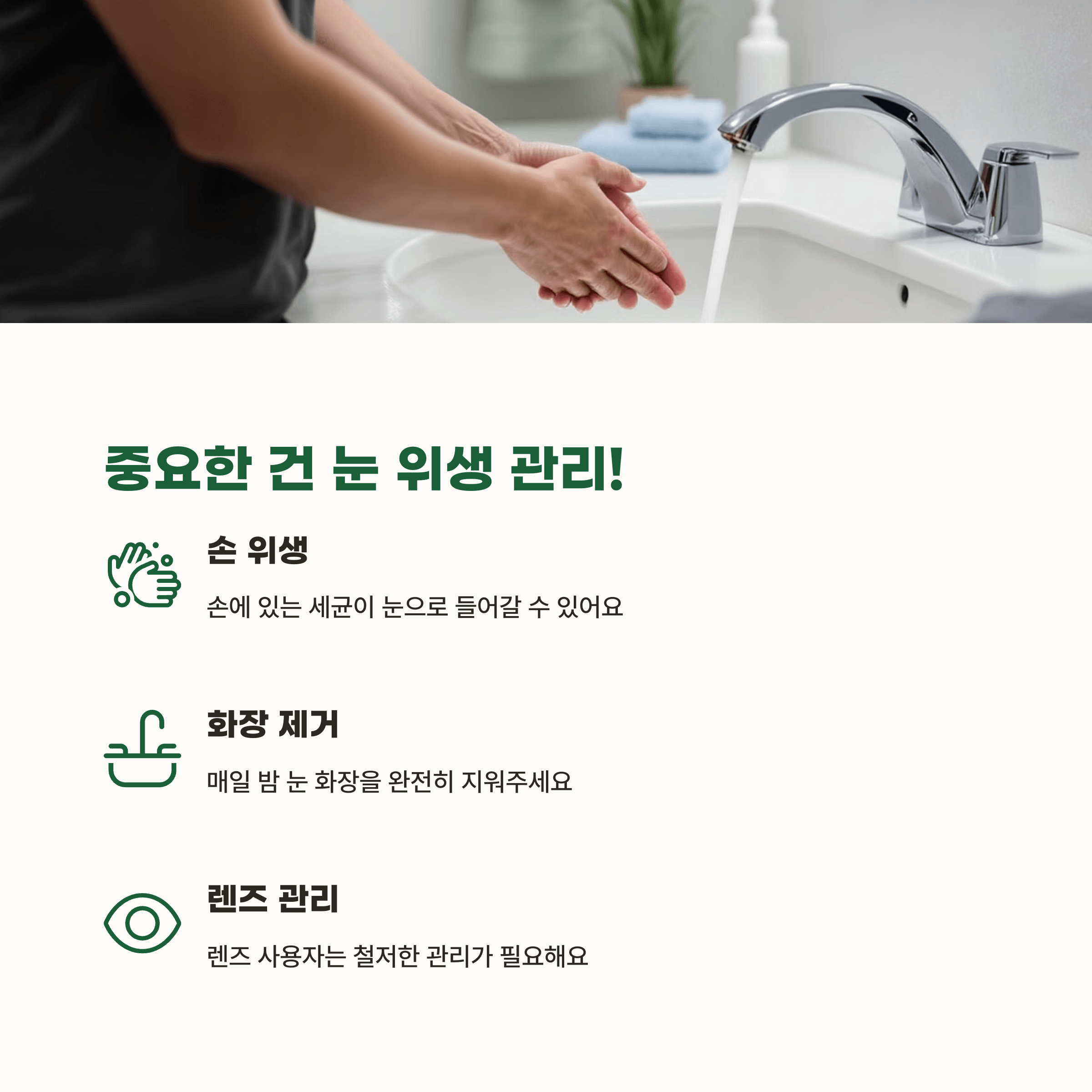 의외로 많은 분들이 눈 주변 청결을 소홀히 해요. 하루 종일 외출하고 돌아와도 눈 화장을 제대로 지우지 않거나 손으로 눈을 자주 만지는 습관이 있다면 눈에 자극이 계속 쌓이게 됩니다. 손에는 수많은 세균이 있는데 무심코 눈을 비비면서 그 세균이 그대로 눈 안으로 들어갈 수 있어요. 특히 렌즈 사용자라면 렌즈 손질이 미흡할 경우 감염 위험이 높아지죠. 매일 밤 자기 전엔 반드시 눈 화장을 지우고 손을 깨끗이 씻는 습관을 들이세요. 작은 습관이 눈 건강을 지켜줍니다.