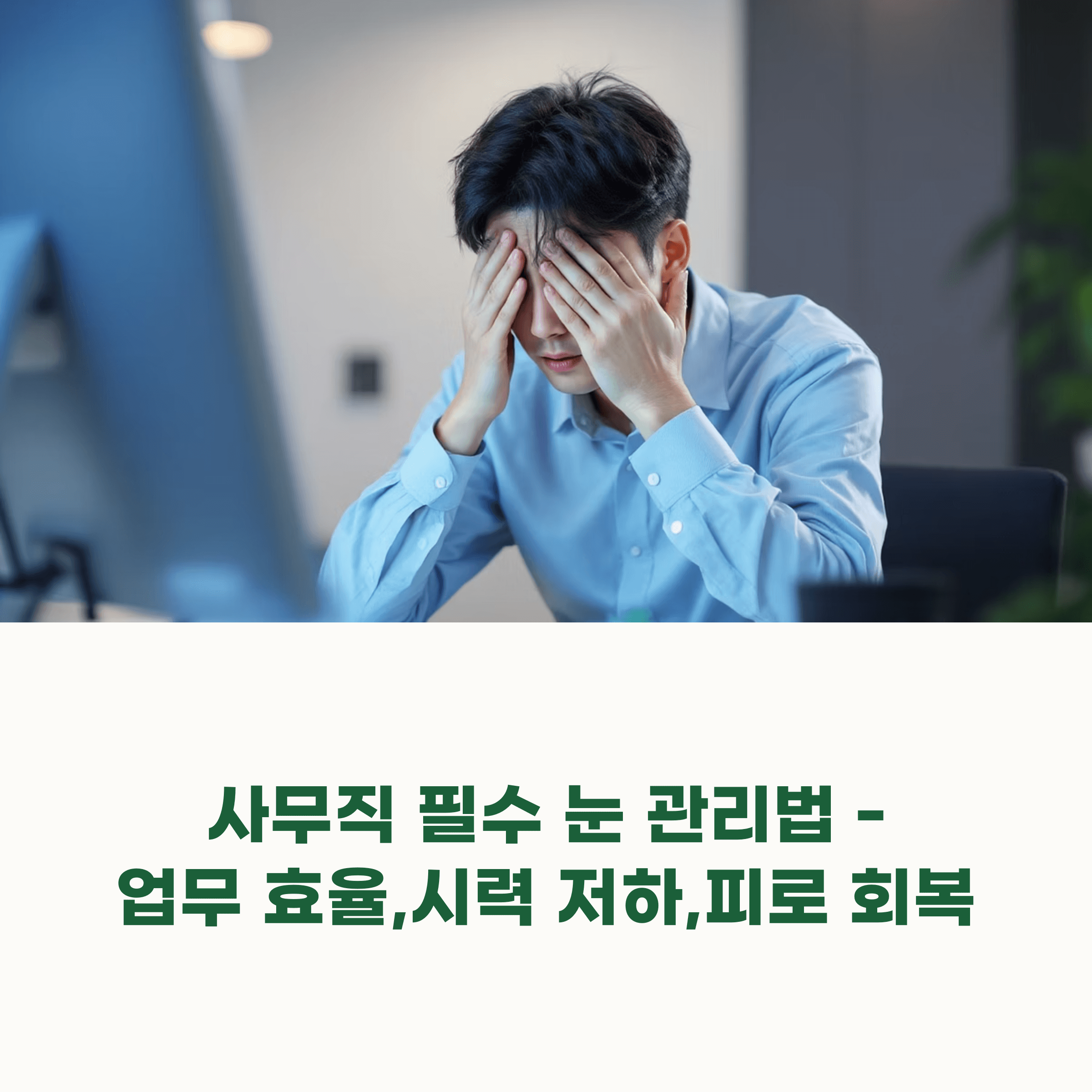 사무직 근무자는 하루 종일 모니터 앞에서 일하는 경우가 많은데요. 이로 인해 눈 건강에 심각한 문제가 발생할 수 있고 더 나아가서는 업무 효율 저하로 이어질 수 있습니다. 오늘은 사무직 종사자를 위한 눈 관리법을 소개하여 시력 저하와 눈의 피로를 예방하고 업무 능률을 높이는 방법을 알려드리겠습니다.