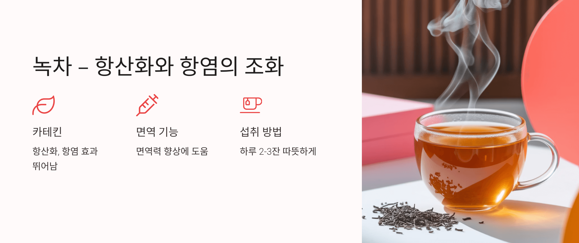 녹차에 풍부한 카테킨(catechin) 성분은 항산화 작용뿐 아니라 항염 효과도 뛰어나요. 염증을 억제하고 면역 기능을 돕기 때문에 축농증 증상 완화에 긍정적입니다. 하루 2~3잔 정도 따뜻하게 마시면 좋고, 카페인이 부담된다면 저 카페인 제품을 선택해도 좋아요.