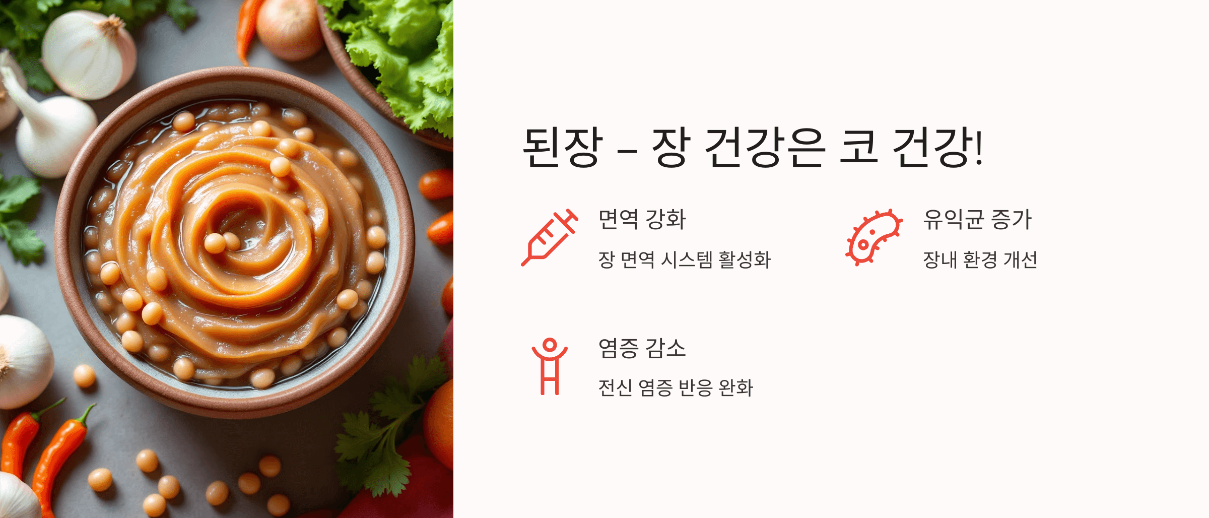 된장이나 청국장 같은 발효식품은 장내 유익균을 늘리고, 면역세포의 70%가 존재하는 장 면역 시스템을 강화해 줘요. 장이 건강해야 염증 반응도 줄어들 수 있답니다. 축농증이 잘 낫지 않는 분들이라면 된장국을 자주 드셔보세요!