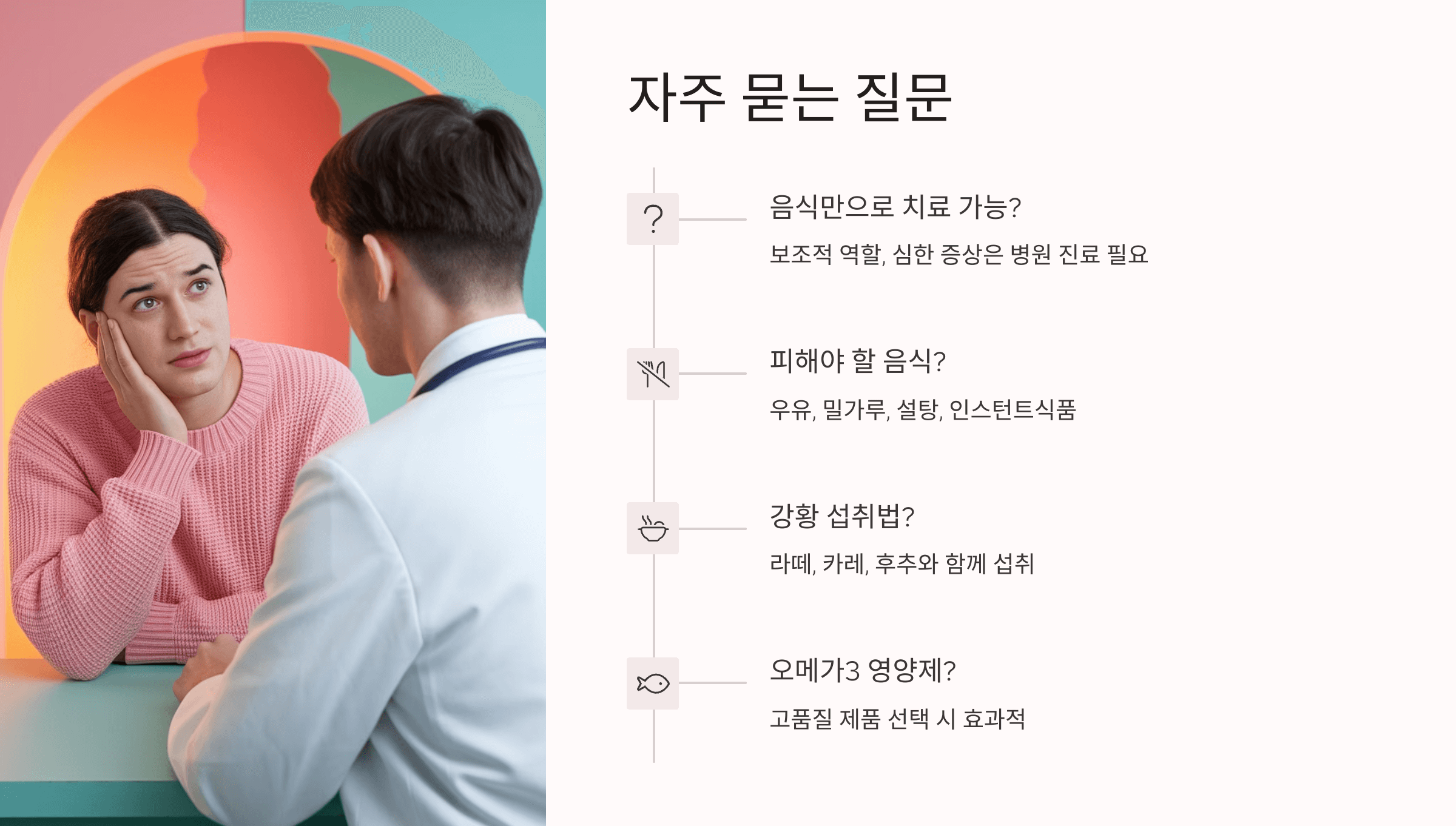 음식은 보조적 역할입니다. 증상이 심하거나 장기화될 경우에는 반드시 약물치료나 병원 진료가 필요합니다.